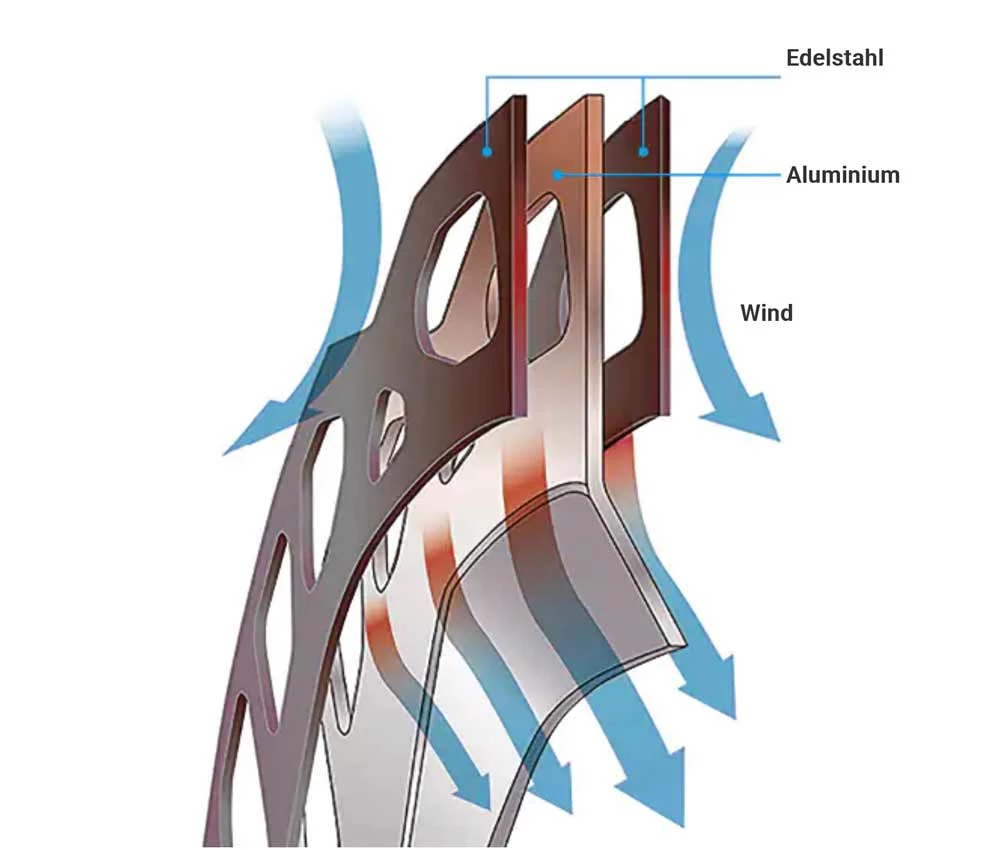 sorgt in Kombination mit der FREEZA Bremsscheiben-Konstruktion fuer schnelle Waermableitung. Das fuehrt zu einer gleichmaessigeren Bremsleistung unter Extrembedingungen, verlaengert die Lebensdauer des Bremsbelags und reduziert Bremskraftverlust und Bremsgeraeusche. Der Aluminium Kern ist ummantelt von der Stahl Bremsflaeche. Diese reduziert die Hitzeentwicklung um gut 25 Prozent und erhoeht die Standfestigkeit der Shimano MTB Discbrakes. Die ueberarbeiteten Ice Tech Freeza Bremsscheiben auf Deore GRX Ultegra Niveau, RT-CL800, wurden so konstruiert, dass sie maximale Waermeableitung sicherstellen, die zu konsistenterer Bremsleistung und laengerer Haltbarkeit der Belaege fuehrt.